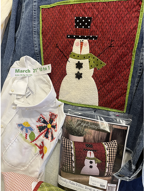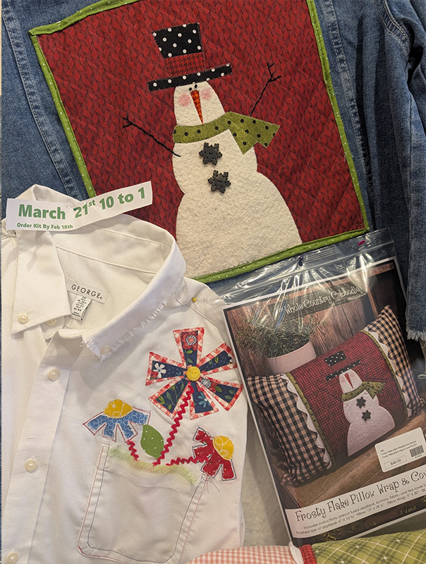In March, learn how to Appliqué a shirt using two different techniques . The appliqué design of your own choice and shapes are laser cut with Heat n Bond Lite Fusible and are ready to assemble.Stop by the store to see all of the cute Whole Country Caboodle list to choose from. There are also samples on the wall to inspire what you might want to Appliqué: a cheap mens shirt, sweat shirt , a Kitchen towel, or a jean jacket! Class fee of $62 includes the discounted 1-month kit for this project (reg. price kit is $40.50) – You need to bring your own shirt/item to appliqué. .
