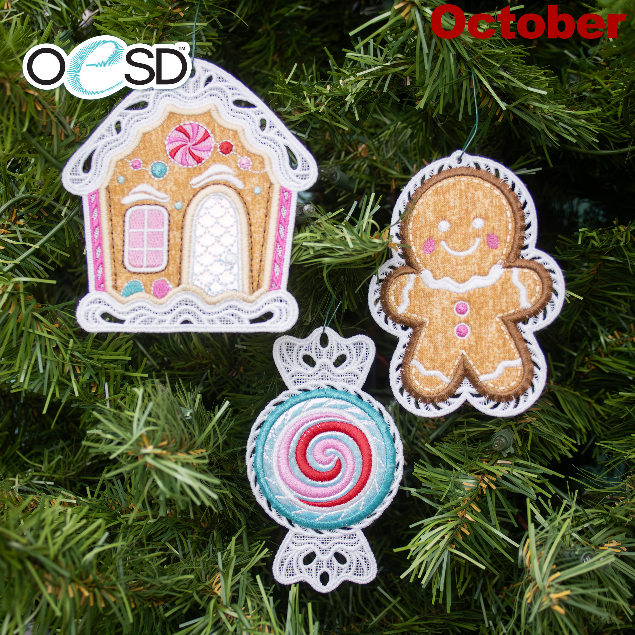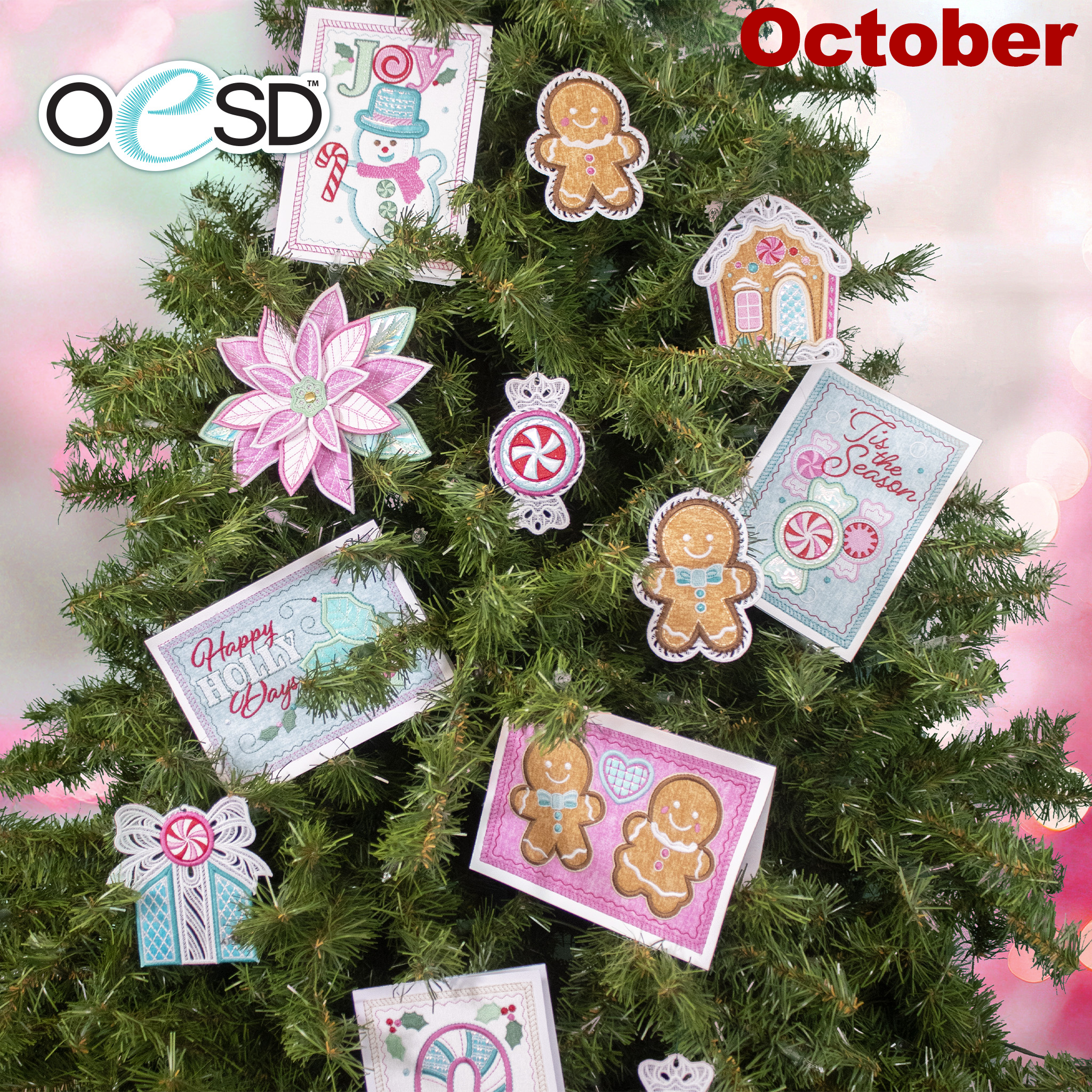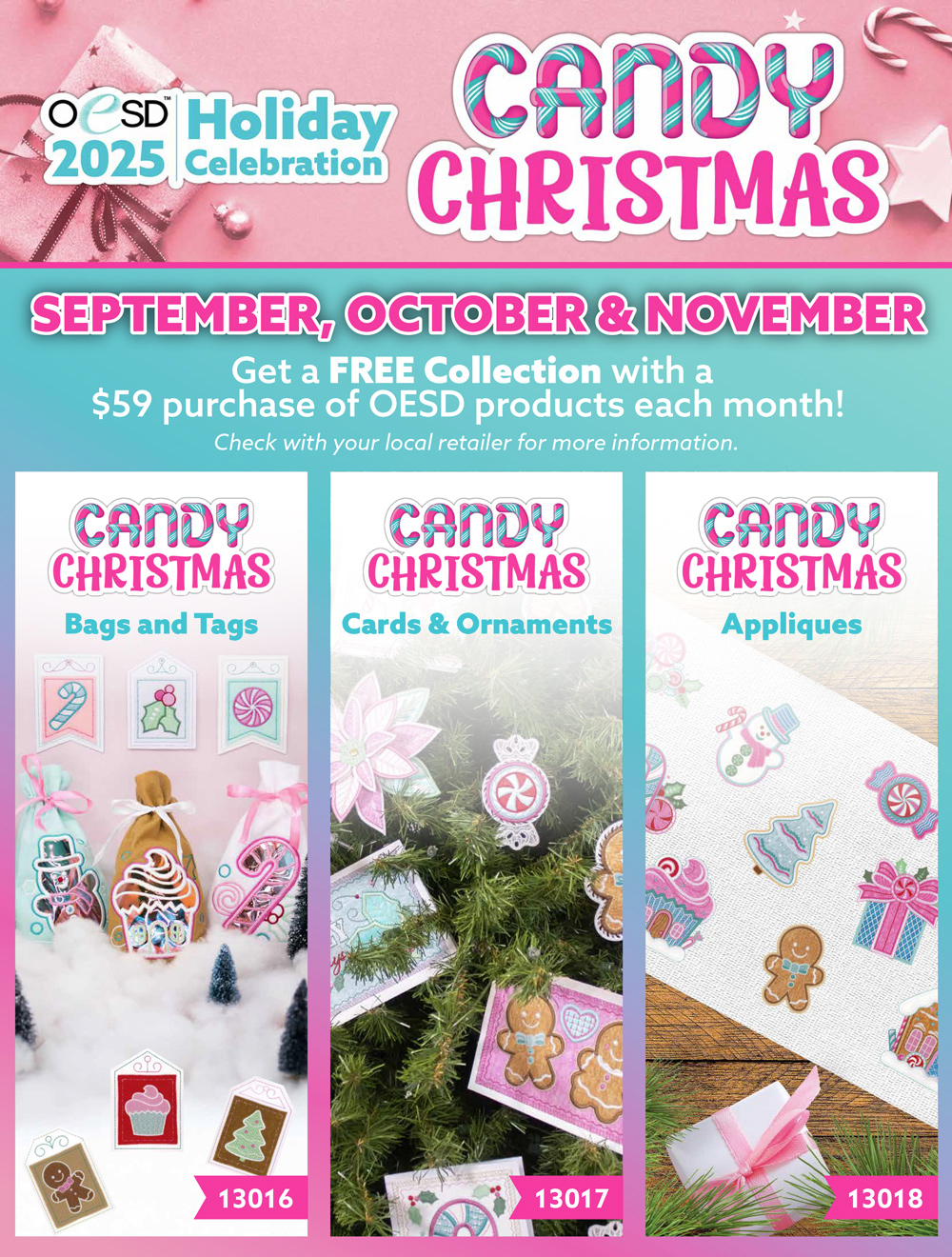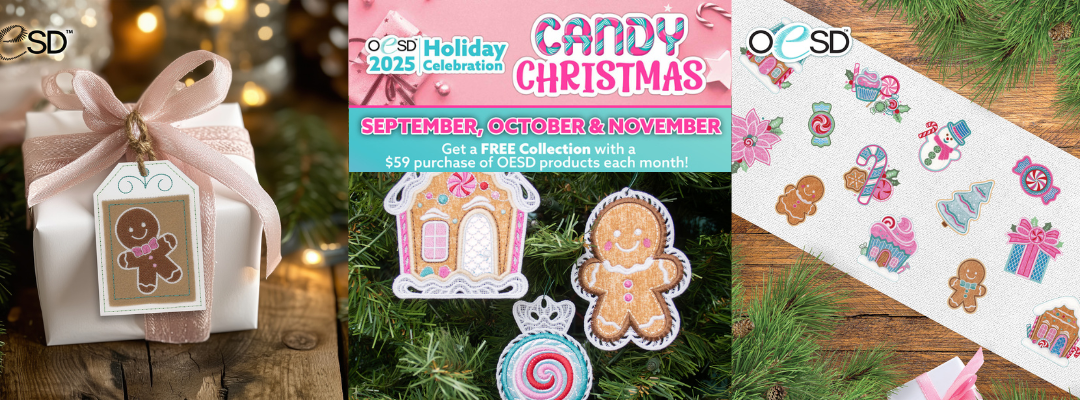 Holiday Celebration is OESD’s annual promotion in which customers get exclusive holiday collections – 1 per month in September, October, and November – for FREE when you spend $59+ on OESD products! Visit us at the shop to purchase OESD products OR shop online at OESD.com. Free design collections automatically are added to your online cart when you check out online at OESD.com! OESD’s Holiday Celebration is a great way to get read for the holidays!
