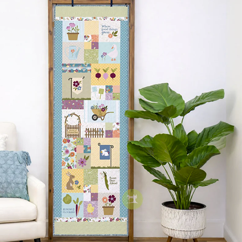 Kimberbell’s 20 x 60″ ladder quilt celebrates springtime with bunnies, blossoms, and so much more. Stitch a watering can, downy chick, and darling goose, then add a medley of spring vegetables! With pieced blocks, sweet sentiments, and fresh fabrics, Cottontail Farm is where the “good things grow.”! FINISHED PROJECT SIZE: 20 x 60″