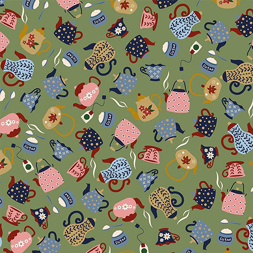 A Spoonful of Sugar by Jennifer Long of Sew A Story for Riley Blake Designs is great for quilting, apparel and home decor. This print features tossed tea kettles, cups and sugar jars.